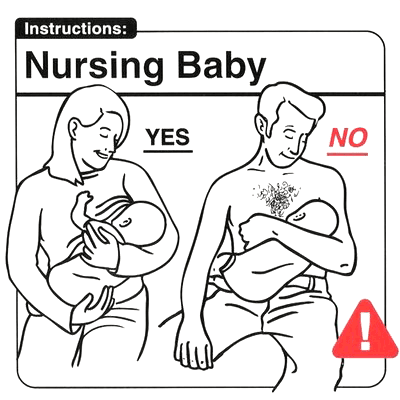 So the doctors have started loading Emily up with all sorts of brochures and pamphlets about pregnancy, screening tests, birthing classes, all that fun stuff. In the latest batch there was a pamphlet just for me! It’s titled “Dad Talk: Breastfeeding your baby? and has a nice little photo of a very macho-looking tattooed guy holding a newborn. Which at first I thought was a great idea — all the pregnancy books are (understandably) aimed exclusively at the mom; I haven’t really seen anything yet that approached things from the future dad’s point of view (excepting the cartoon above, one of a very entertaining set of instructions my brother-in-law sent.)
